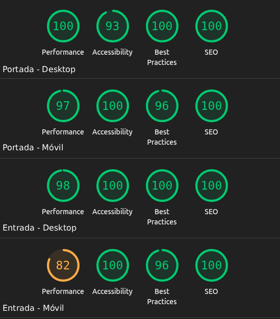 Si esta web estuviera bajo WordPress, seguramente no tendría (en parte, por mis conocimientos actuales sobre WordPress) los números que tiene en LightHouse, ya que dependería de la plantilla, de los plug-ins, de la base de datos, de que todo esté actualizado...